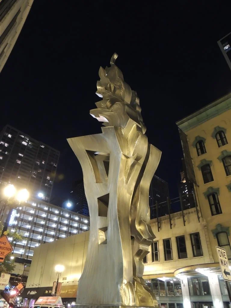 Chicago is another city that was wiped out by fire and while there's no official monument, I see Richard Hunt's sculpture as a memorial to the Great Fire of Chicago. It's very modern, depicting a tall building that is melting under the flames.